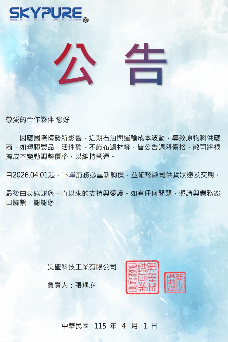 因應國際情勢所影響,近期石油與運輸成本波動,導致原物料供應商,如塑膠製品、活性碳、不織布濾材等,皆公告調漲價格,敝司將根據成本變動調整價格,以維持營運。